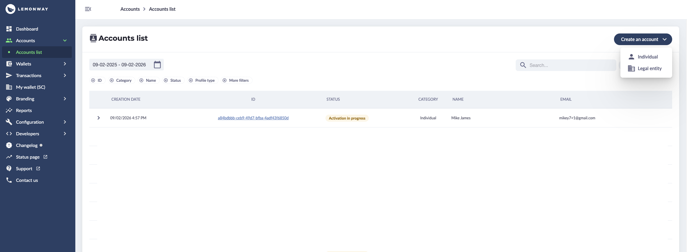 Creating an account via the Lemonway Dashboard is straightforward and is the easiest way to get started in your environment. However, you should only use this method if you are creating a small number of accounts and have not yet industrialized the account creation process on your platform. You will require specific information for the Legal Entity or individuals for whom you are creating the account.