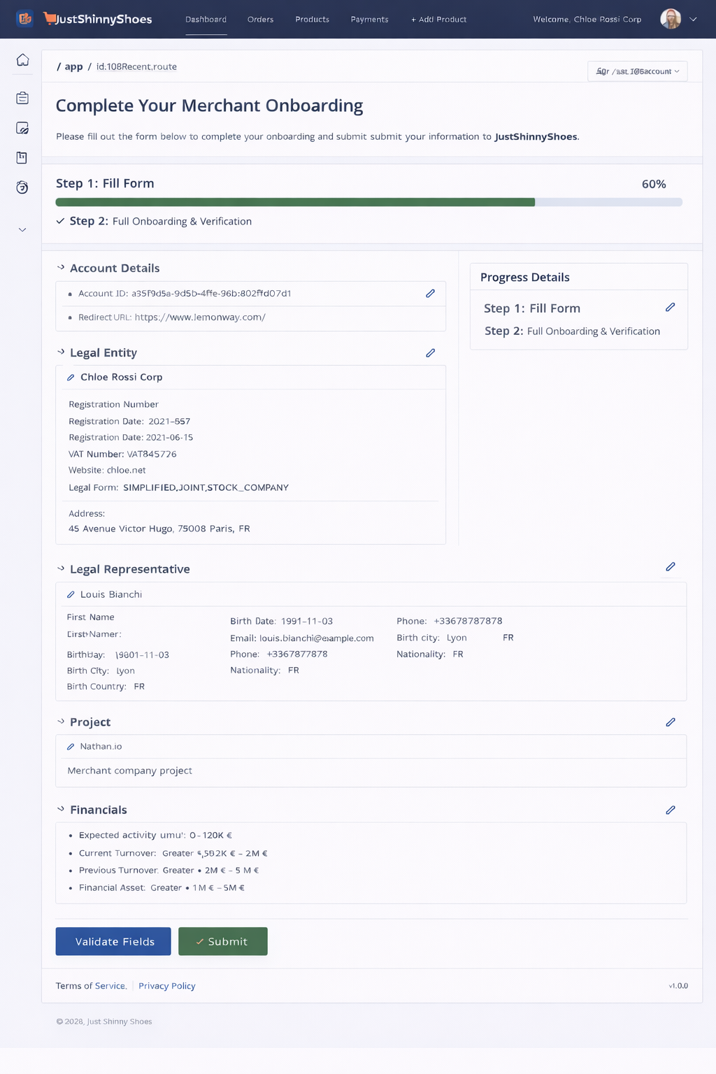 How account creation is incorporated into your platform is entirely up to you; required information may differ depending on the type of legal entity you create. In our example, we are creating a seller company account; therefore, specific data is required, such as tax codes, legal representatives, shareholding details, and financial status, to name a few.