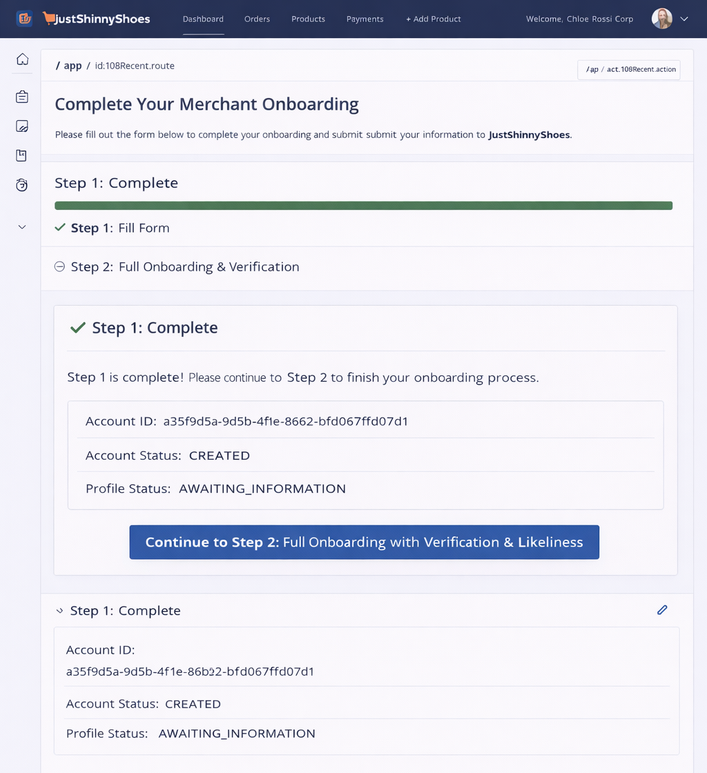 From the seller's perspective, a successful account creation means Step 1 is complete, and Step 2 is the verification step they must complete before they can start selling on your platform.