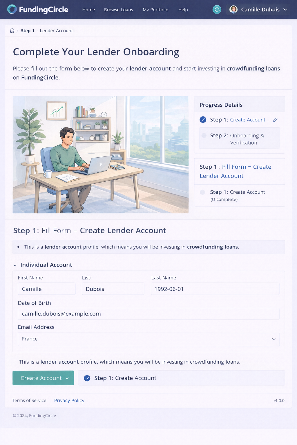 Before you start the onboarding and verification process, you must first create an individual account and assign it a LENDER profile with a CROWDLENDING activity.