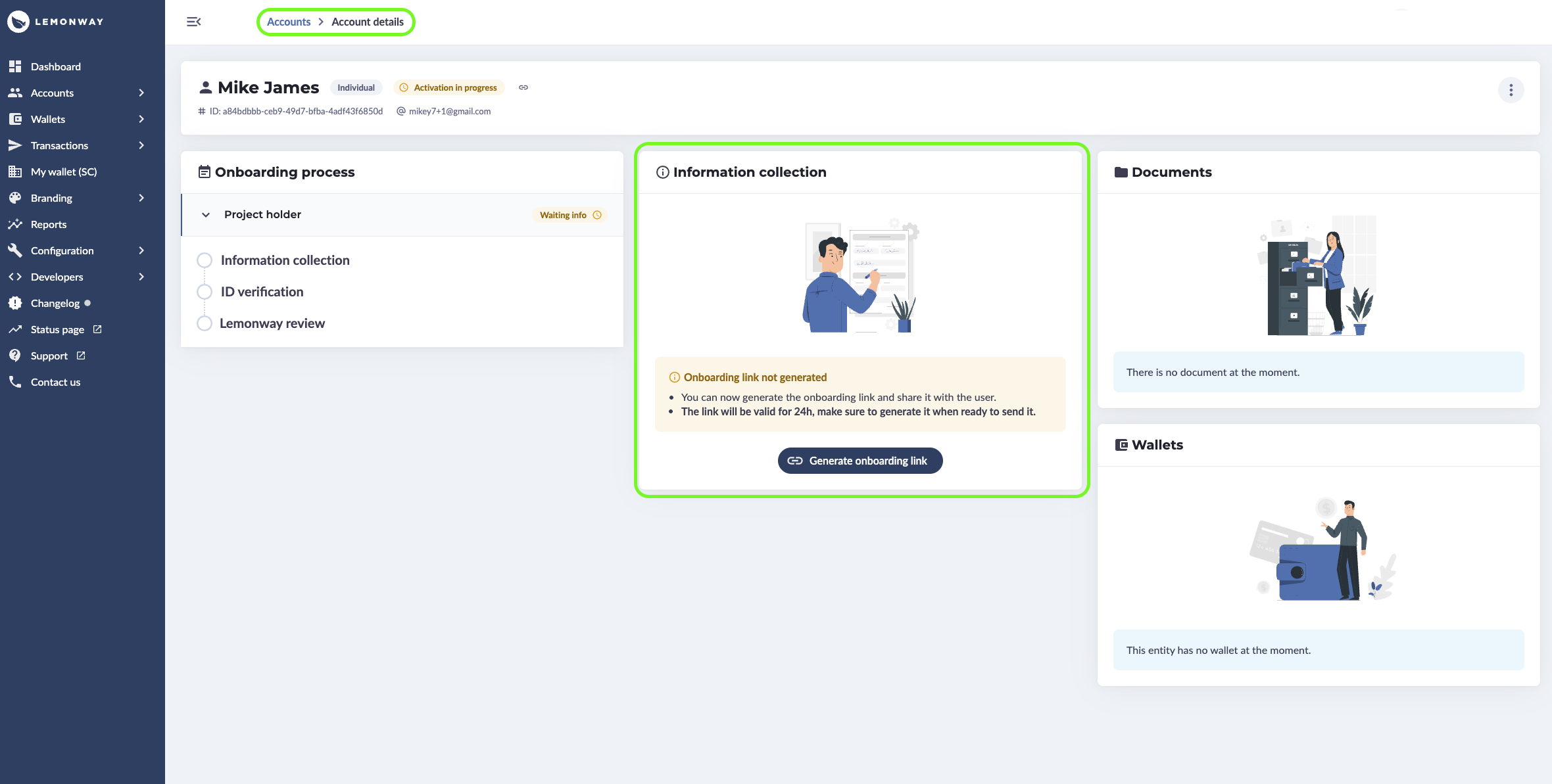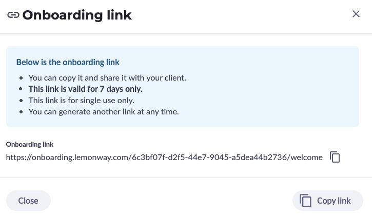 Onboarding link created in Lemonway Dashboard