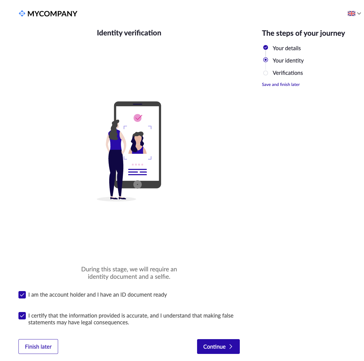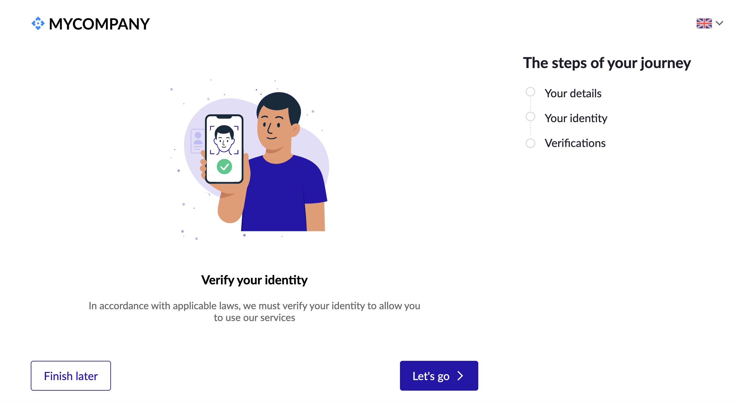 You can rebrand the Online Onboarding interface with your platform colours, your company logo, buttons and links from the Dashboard. See: Onboarding Branding