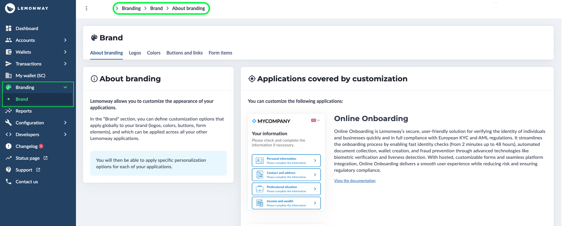 Branding: Online Onboarding in Lemonway Dashboard