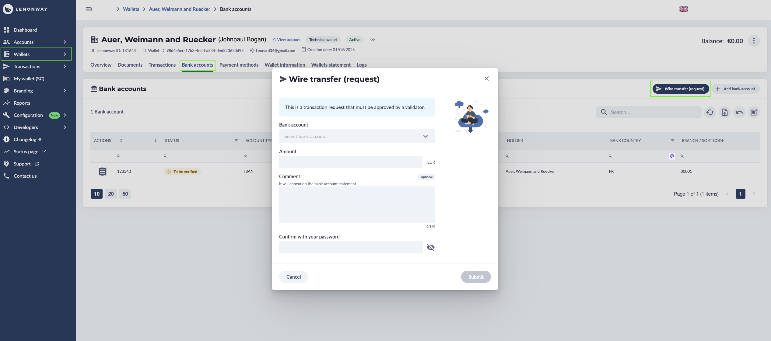 Wire transfer using the Lemonway Dashboard